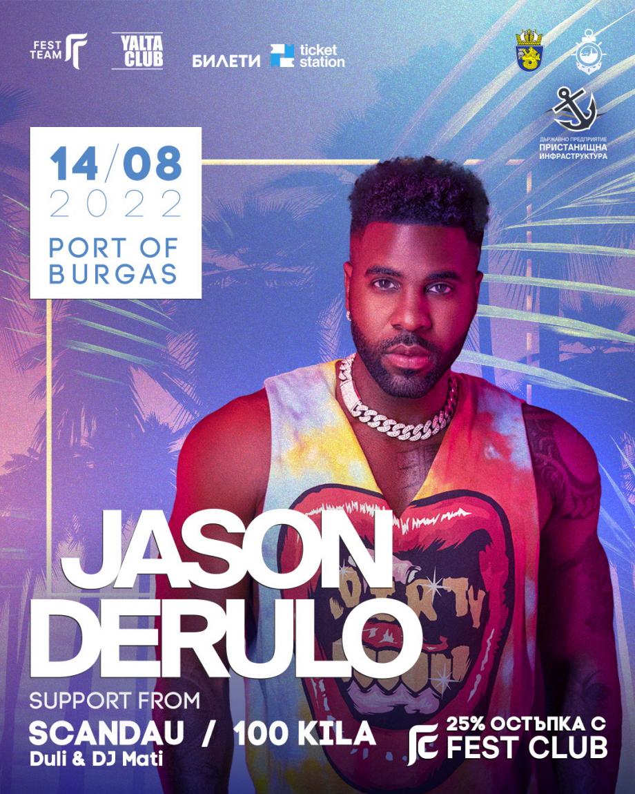 Jason Derulo идва за своя първи концерт в България на 14 август в Бургас. Мултидисциплинарен артист – певец, композитор, танцьор и актьор, Jason Derulo носи актуалната си слава гордо във всички интернет платформи. Той е един от 10-те най-популярни изпълнители с профили в Tik Tok с повече от 50 милиона последователи и не рядко избира именно тази уеб платформа за музикалните премиери на новите си песни. Певецът от хаитянски произход има повече от 7 милиарда гледания в YouTube и над 200 милиона продажби.