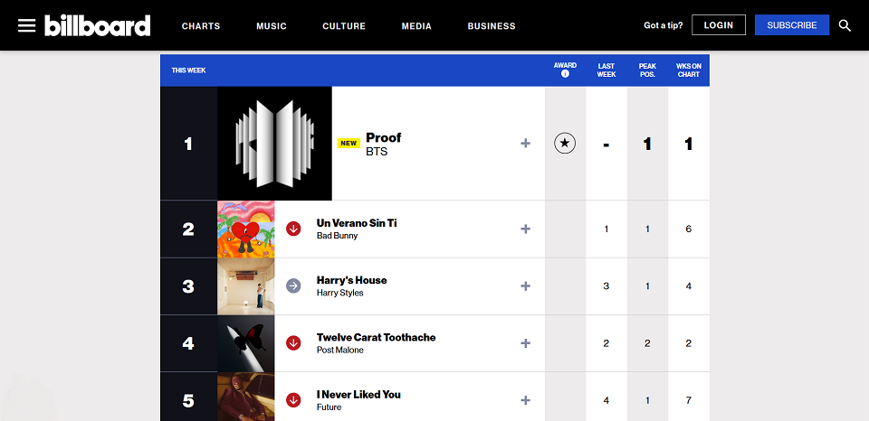Новият албум-антология на BTS - "Proof" дебютира директно на първото място в американската класация Billboard 200. Така К-поп принцовете, за които се бори истинска ARMY от милиони фенове, са на върха на престижния чарт за шести път.