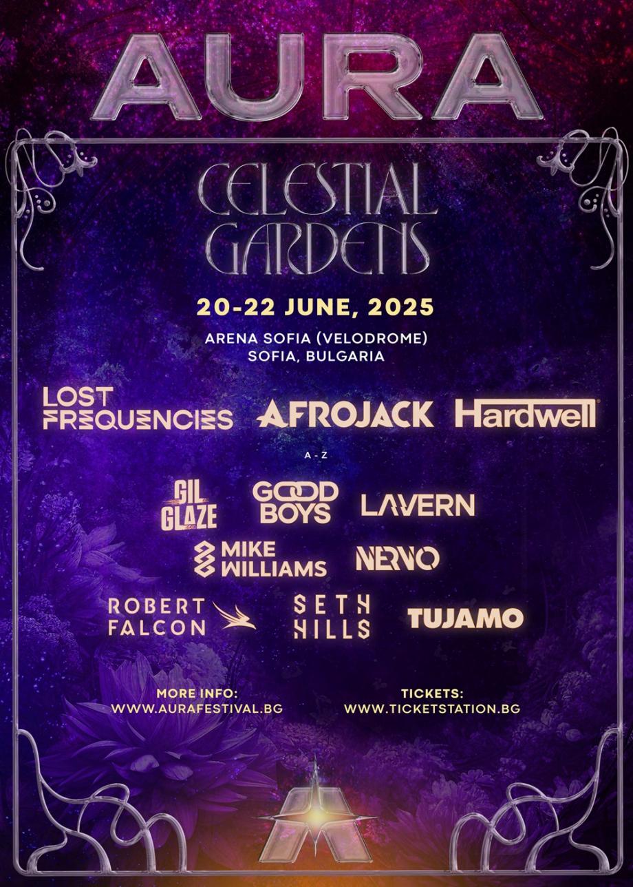 Тематични сцени и зони, съзвездие от най-добрите диджеи в света и безкрайна енергия – това е вселената на AURA. Сред хедлайнерите са легендарният Hardwell – двукратен Номер 1 в престижната класация Top 100 на DJ MAG, един от най-слушаните електронни артисти в света Lost Frequencies и носителят на „Грами“ Afrojack. Главната сцена ще впечатлява публиката всяка вечер с трансформираща се атмосфера, която обединява звук, светлина и зашеметяващи визуални ефекти – обещаващи да превърнат всяка секунда в незабравимо преживяване.