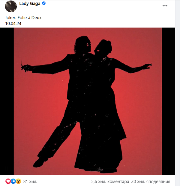 През юни светското издание The Hollywood Reporter обяви, че Лейди Гага е започнала преговори за ролята на Харли Куин - приятелката на Жокера. А от публикации на певицата и актриса в социалните мрежи, можем да потвърдим участието ѝ. Тя сподели кратък тийзър със силуетите на двамата, придружен от името на лентата и премиерната дата: